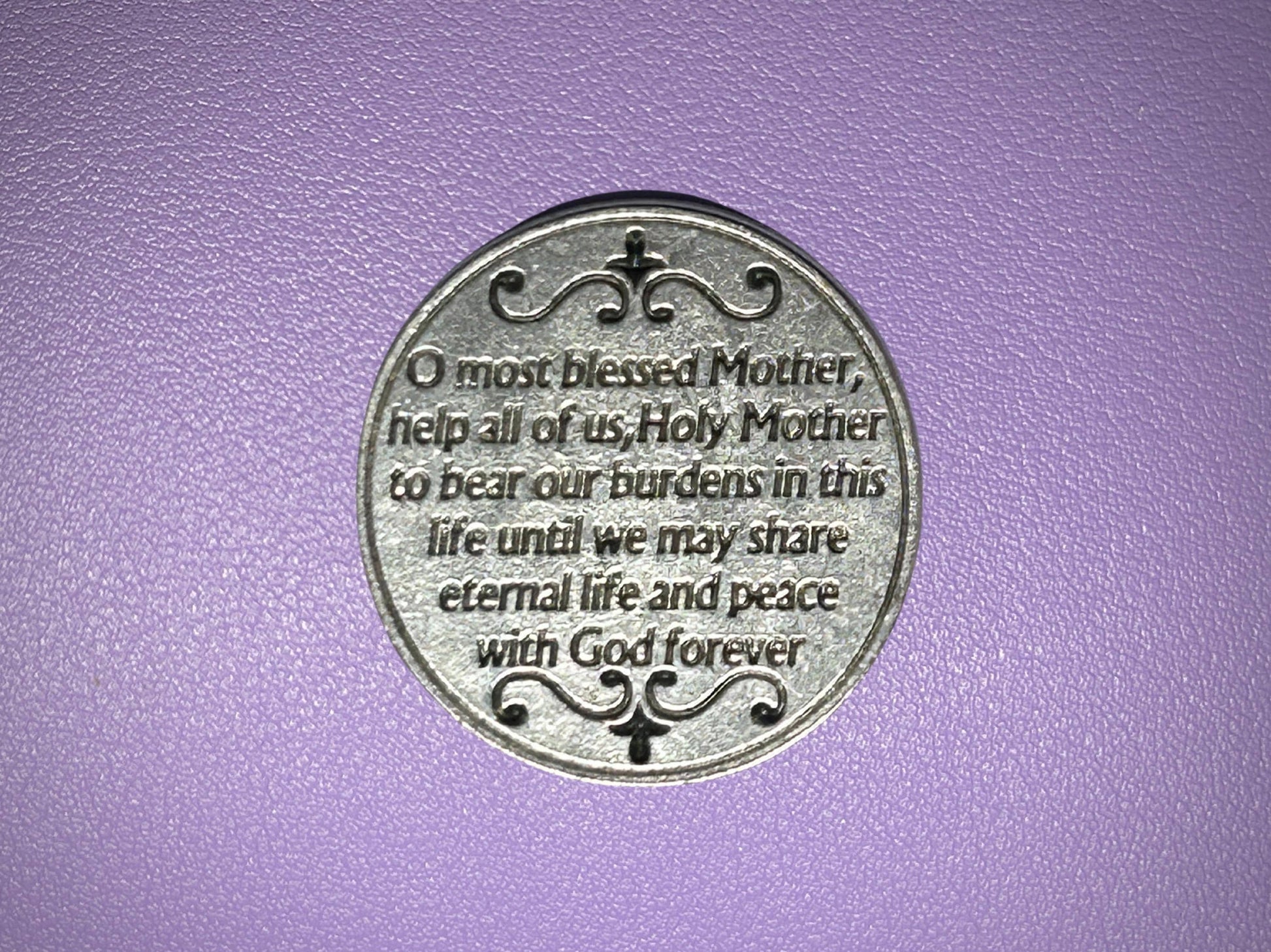Introducing the Sacred Heart of Mary pocket token! This token features the Immaculate Heart of Mary on the front and the heartfelt prayer, “O most blessed Mother, help all of us, Holy Mother to bear our burdens in this life until we may share eternal life and peace with God forever,” on the back. It’s a perfect keepsake for anyone seeking comfort, hope, and the loving intercession of the Blessed Mother.