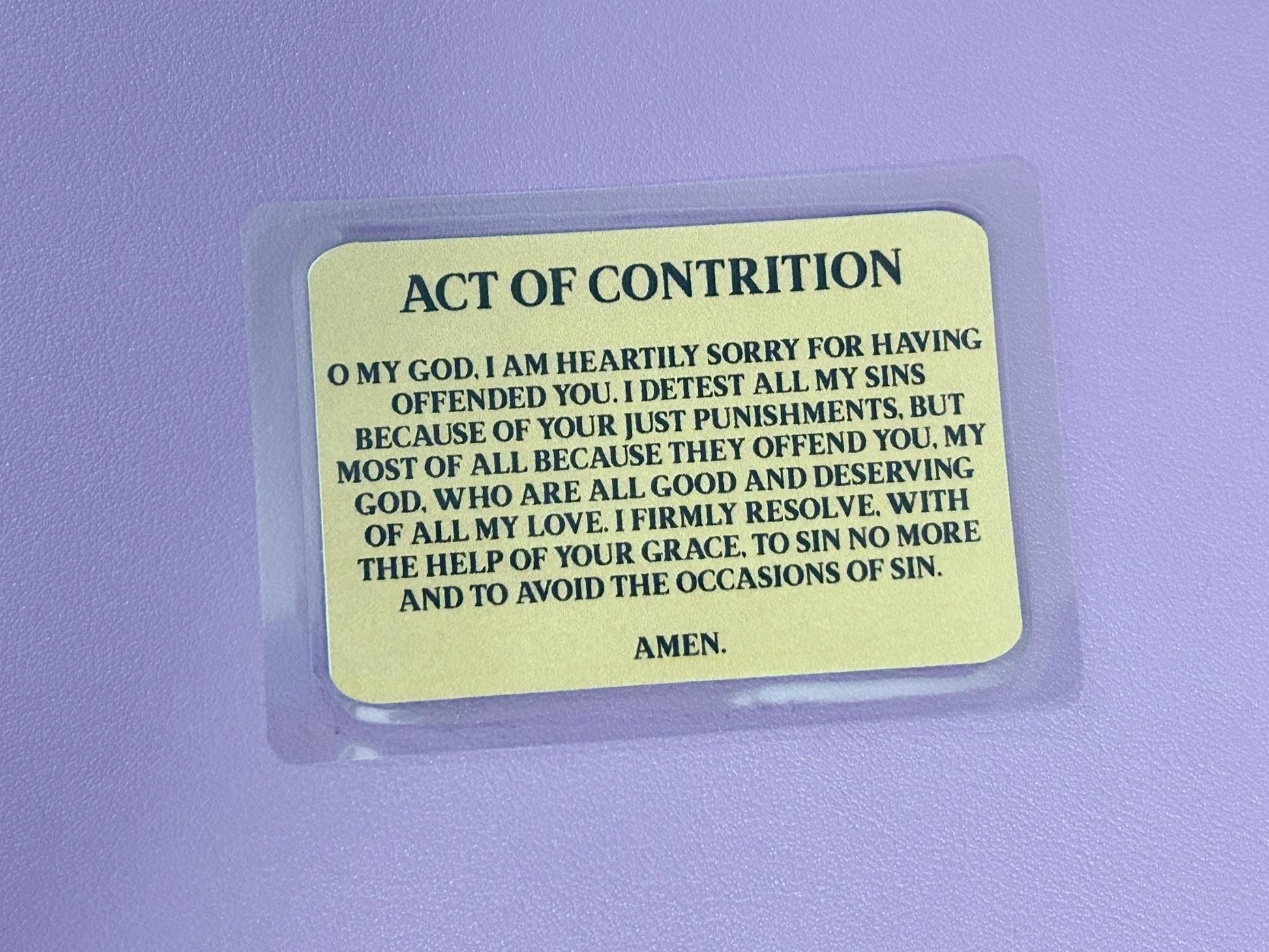 On the front: a bold, simple affirmation—“I Am Catholic”—designed to spark reflection and courage in everyday life. On the back: the traditional Act of Contrition, a prayer of repentance and renewal, perfect for sacramental preparation or daily devotion.