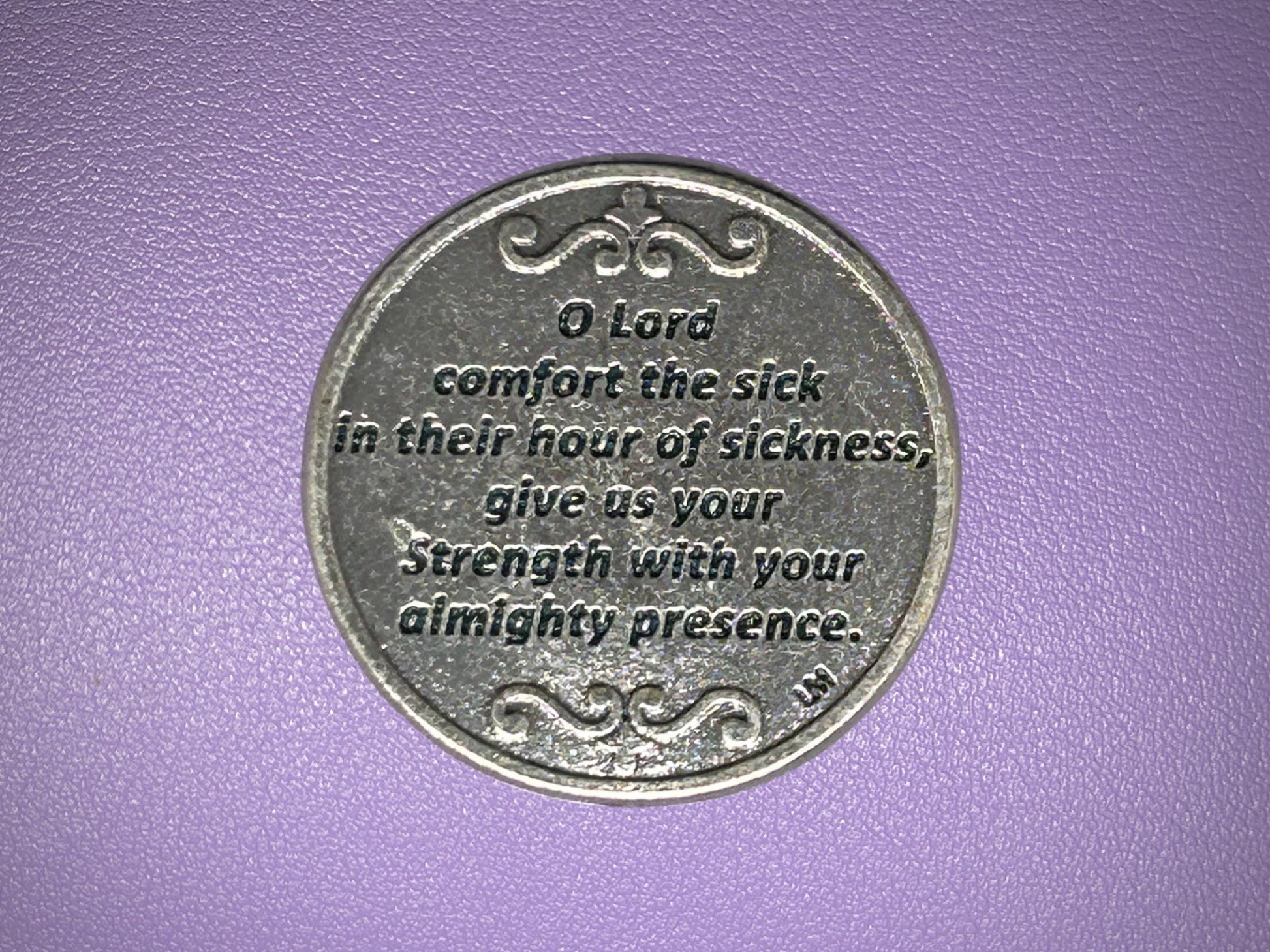 Each pocket token features the image of the Sacred Heart of Jesus on the front and "O Lord comfort the sick in their hour of sickness, give us your Strength with your almighty presence".