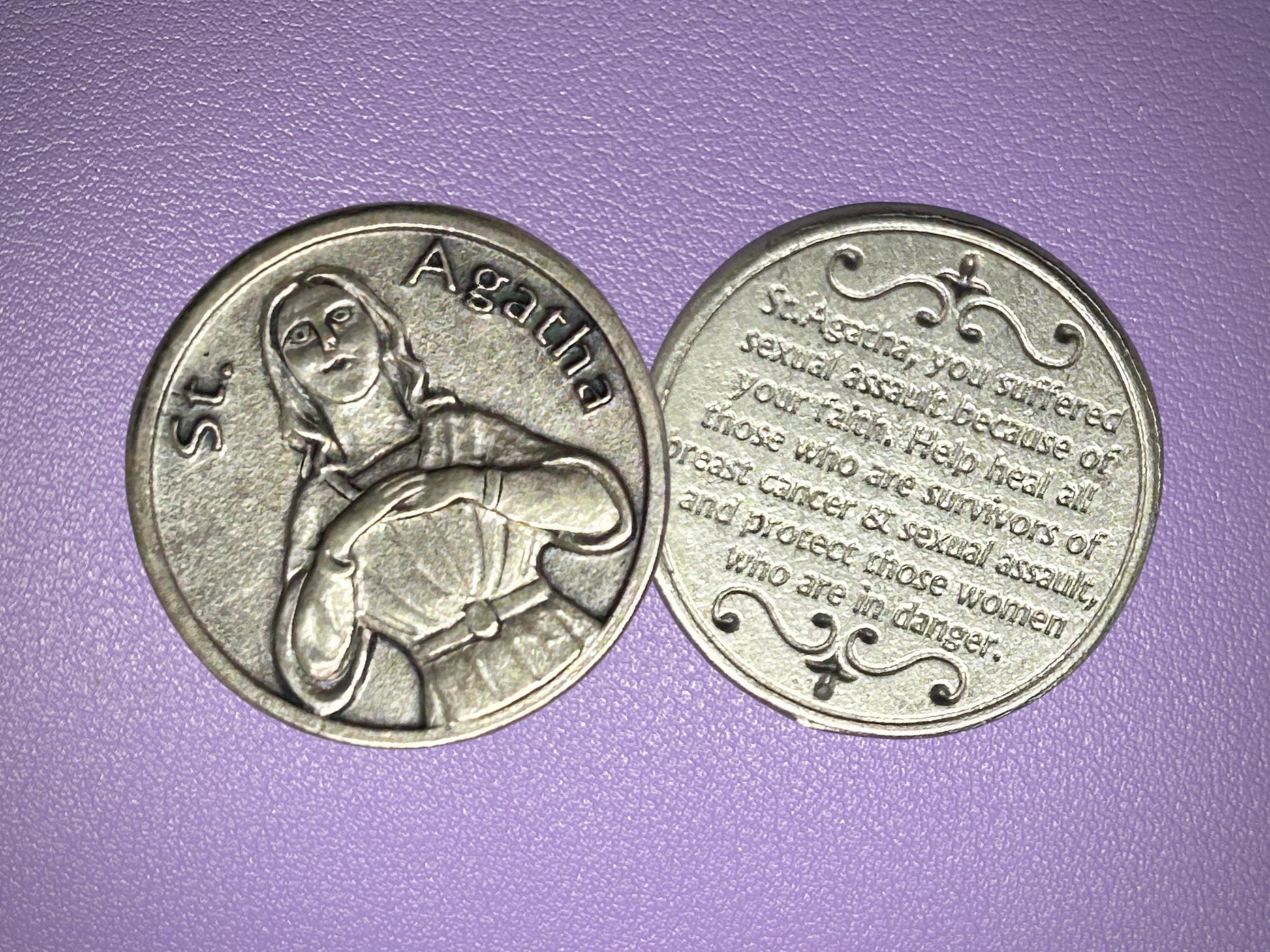 A symbol of strength, courage, and healing — carry St. Agatha with you or gift her to someone facing the fight of their life. This powerful 1.25-inch silver oxidized pocket toekn of St. Agatha honors the brave virgin martyr and beloved patron saint of breast cancer patients, survivors, and nurses. Her story is one of unwavering faith in the face of unspeakable suffering, making her a powerful companion for anyone in need of hope, healing, and divine strength.