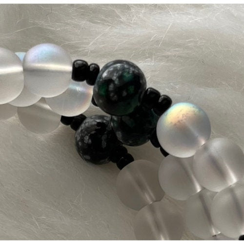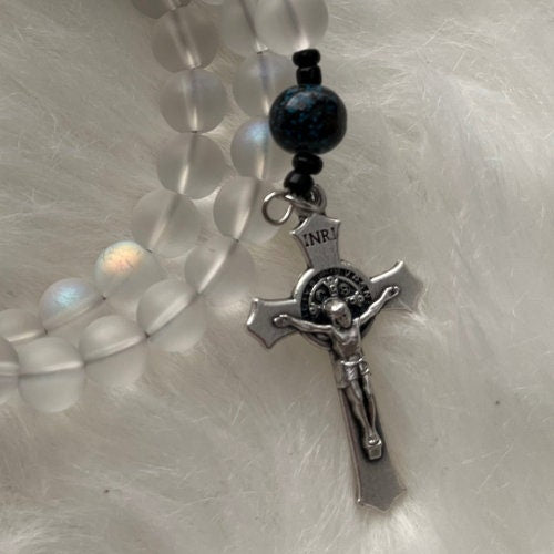 Each rosary is handmade with 8mm glass beads. Hail Mary beads are beautiful and change color with light. Wrap rosaries measure 7 1/2”, will wrap 2-3 times around most average to large wrists and maintain its shape.