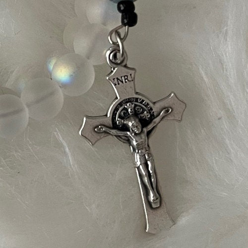 Each rosary is handmade with 8mm glass beads. Hail Mary beads are beautiful and change color with light. Wrap rosaries measure 7 1/2”, will wrap 2-3 times around most average to large wrists and maintain its shape.
